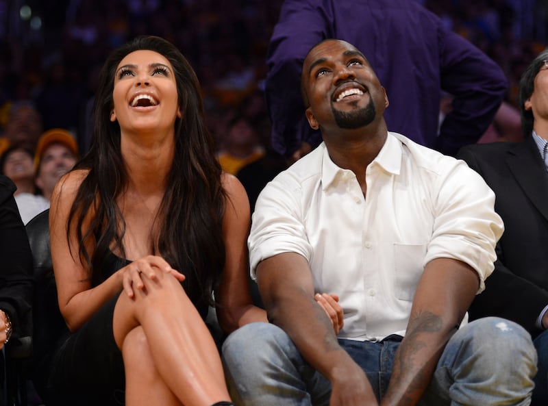 Photos: Kim Kardashian through the years 2012: Kim Kardashian and rapper Kanye West watch the video board from their courtside seats as the Los Angeles Lakers take on the Denver Nuggets in Game Seven of the Western Conference Quarterfinals in the 2012 NBA Playoffs on May 12, 2012, at Staples Center in Los Angeles. (Harry How/Getty Images)