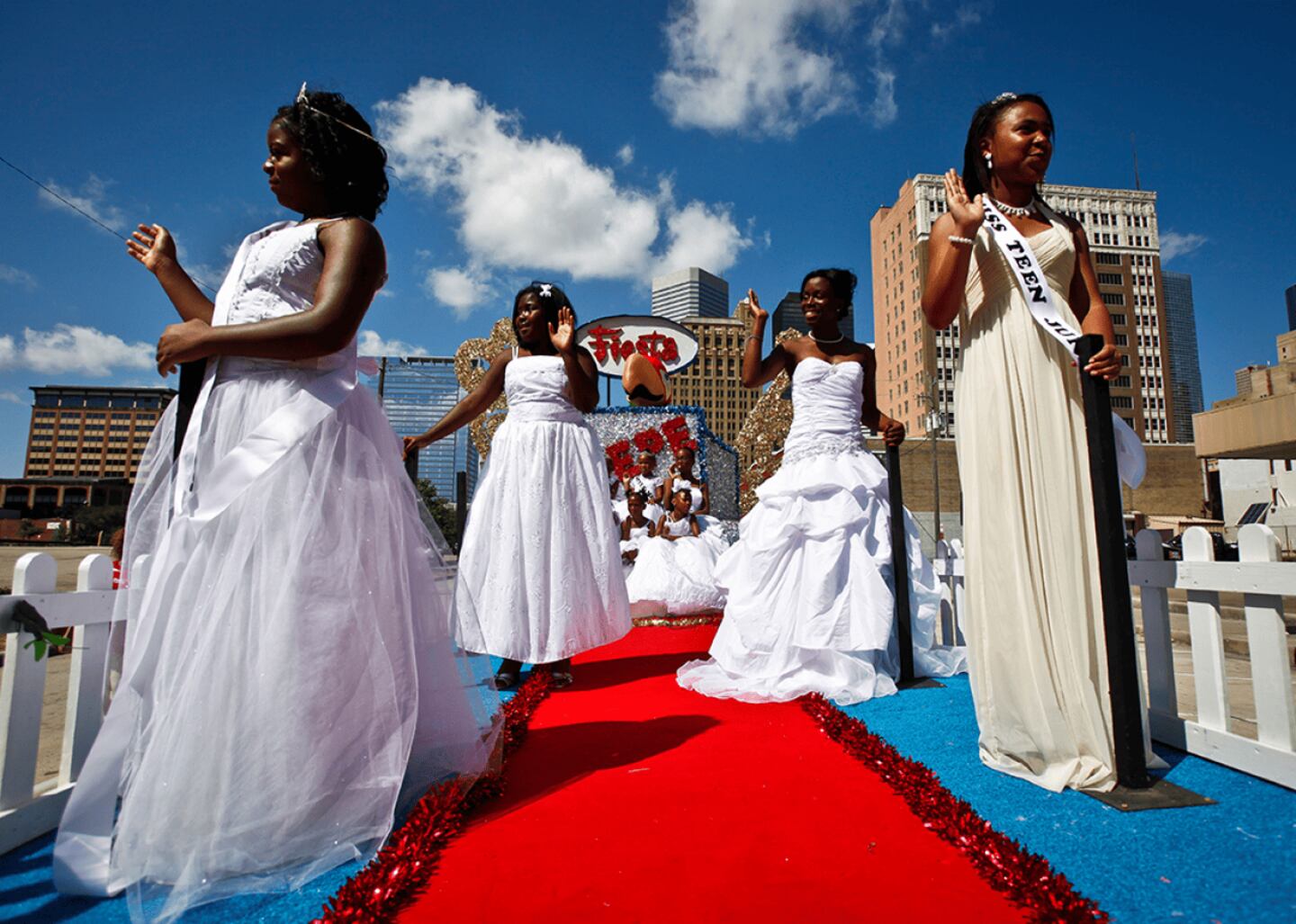 Parades have long been a Juneteenth tradition. Here, a mother and child watch a Unity March heading toward Houston's Hermann Park. Modern-day celebrants can attend Juneteenth parades in places like Atlanta, Philadelphia, and New York City.