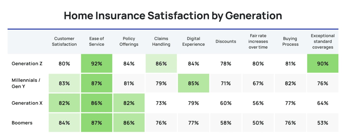 - Overall, customer satisfaction is high across generations, although Gen Z is less impressed when it comes to auto insurance.