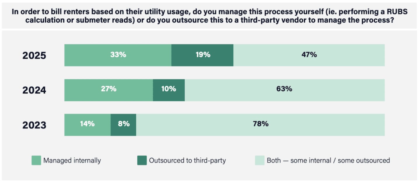 One of the main reasons property managers likely choose utilities-included rent or charge a flat monthly rate is resource strain. The end-to-end utility management process is tedious, from auditing invoices to generating bills. It can seem far easier to calculate a recurring flat fee, especially when utilities are managed in-house. Modern solutions and billing partners are highly accessible today. Digital tools and dedicated teams can assist properties with tracking usage, allocating charges, and recouping utility costs from residents. Despite this, property teams still largely manage their usage-based utility operations in-house — though third-party outsourcing has grown from 8% to 19% since 2023.