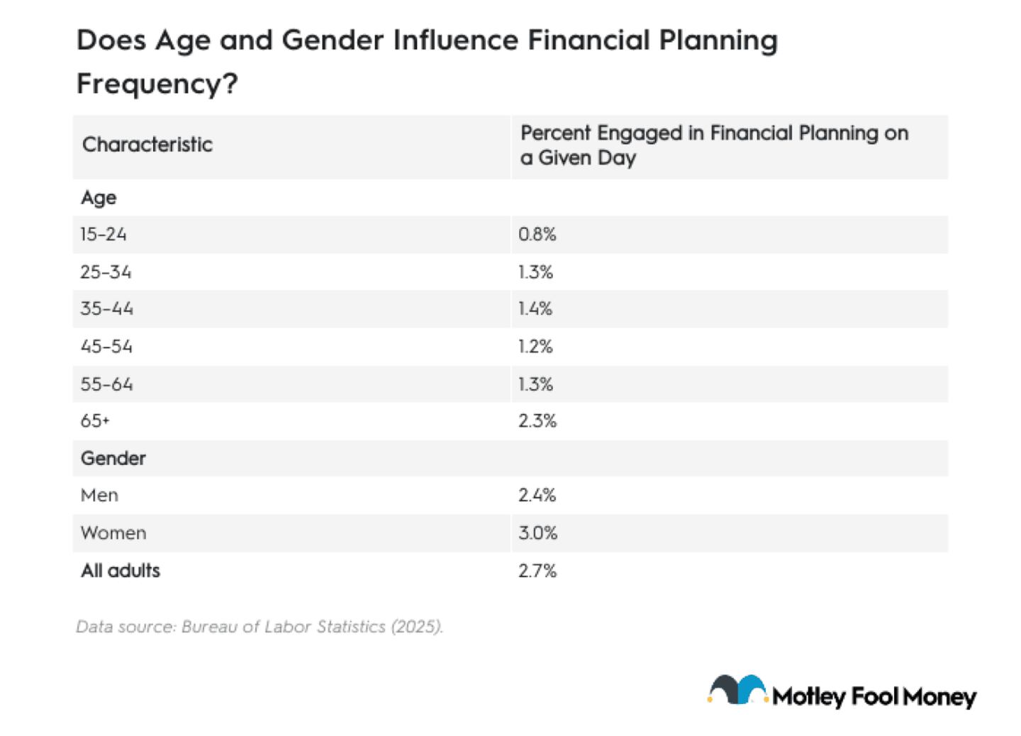 According to a Motley Fool Money survey of 2,000 adults, nearly half of Americans (46%) say they plan their finances on a regular schedule. But behavioral data from the Bureau of Labor Statistics tells a different story: Only 2.7% of Americans do any financial planning on a given day.