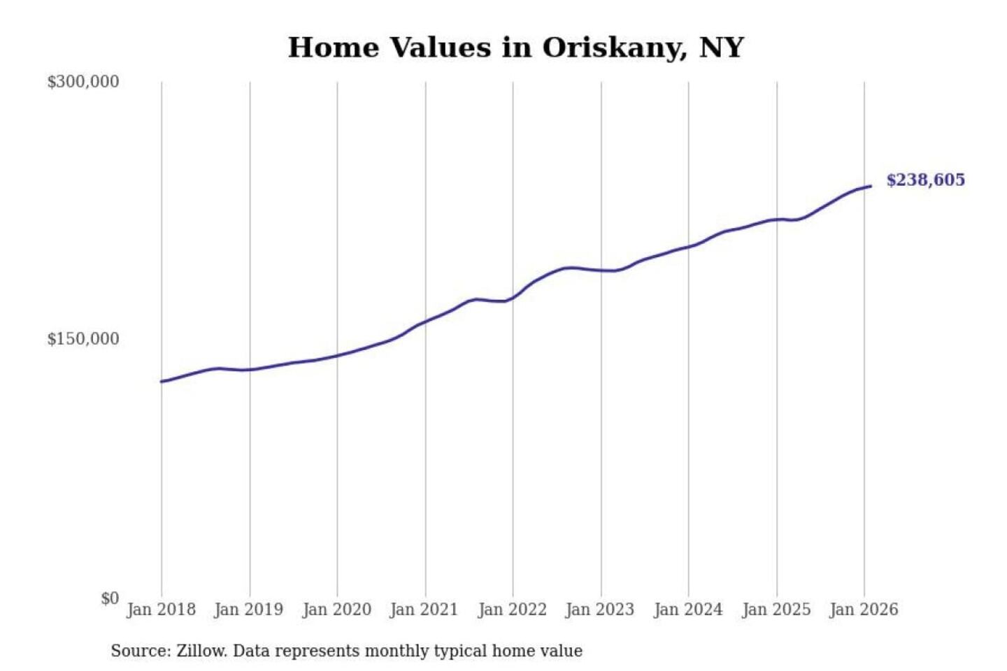 Stacker compiled a list of cities with the most expensive homes in the Utica-Rome, NY metro area using data from Zillow. Charts show the monthly typical home value since January 2018.