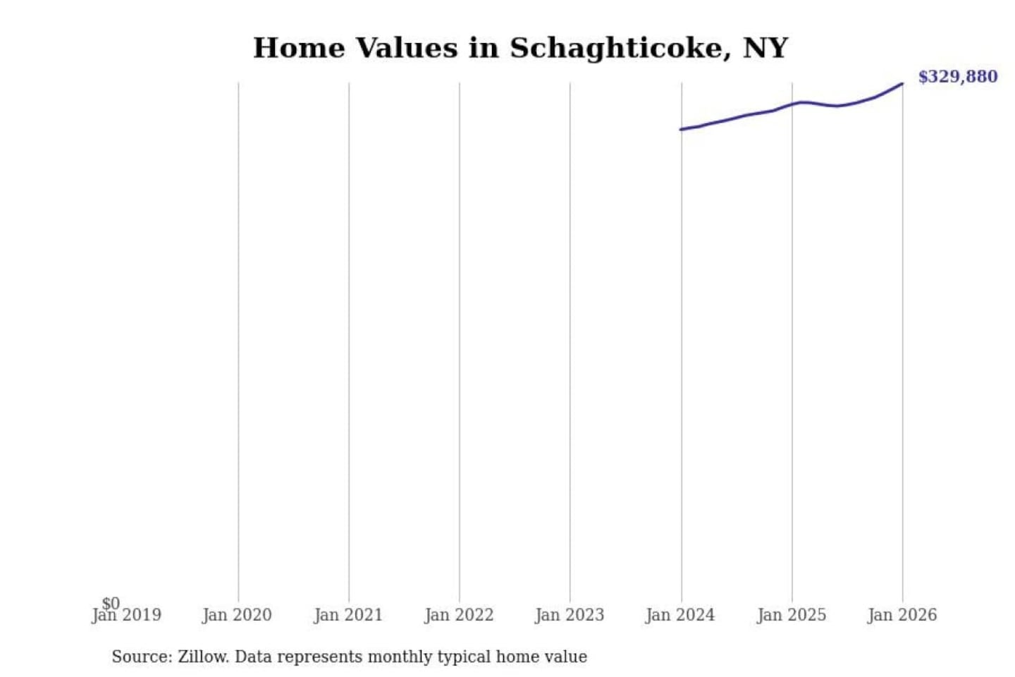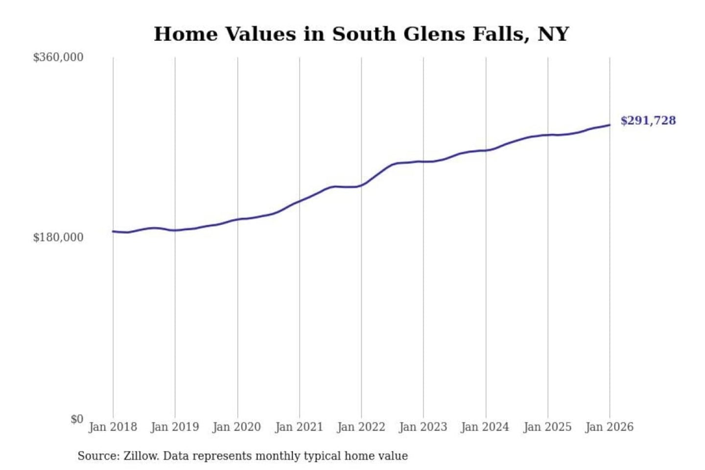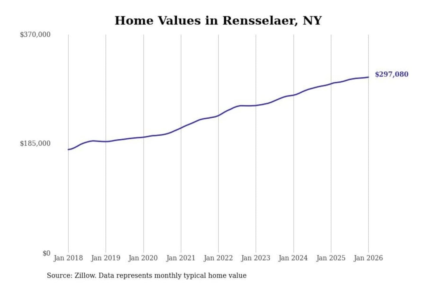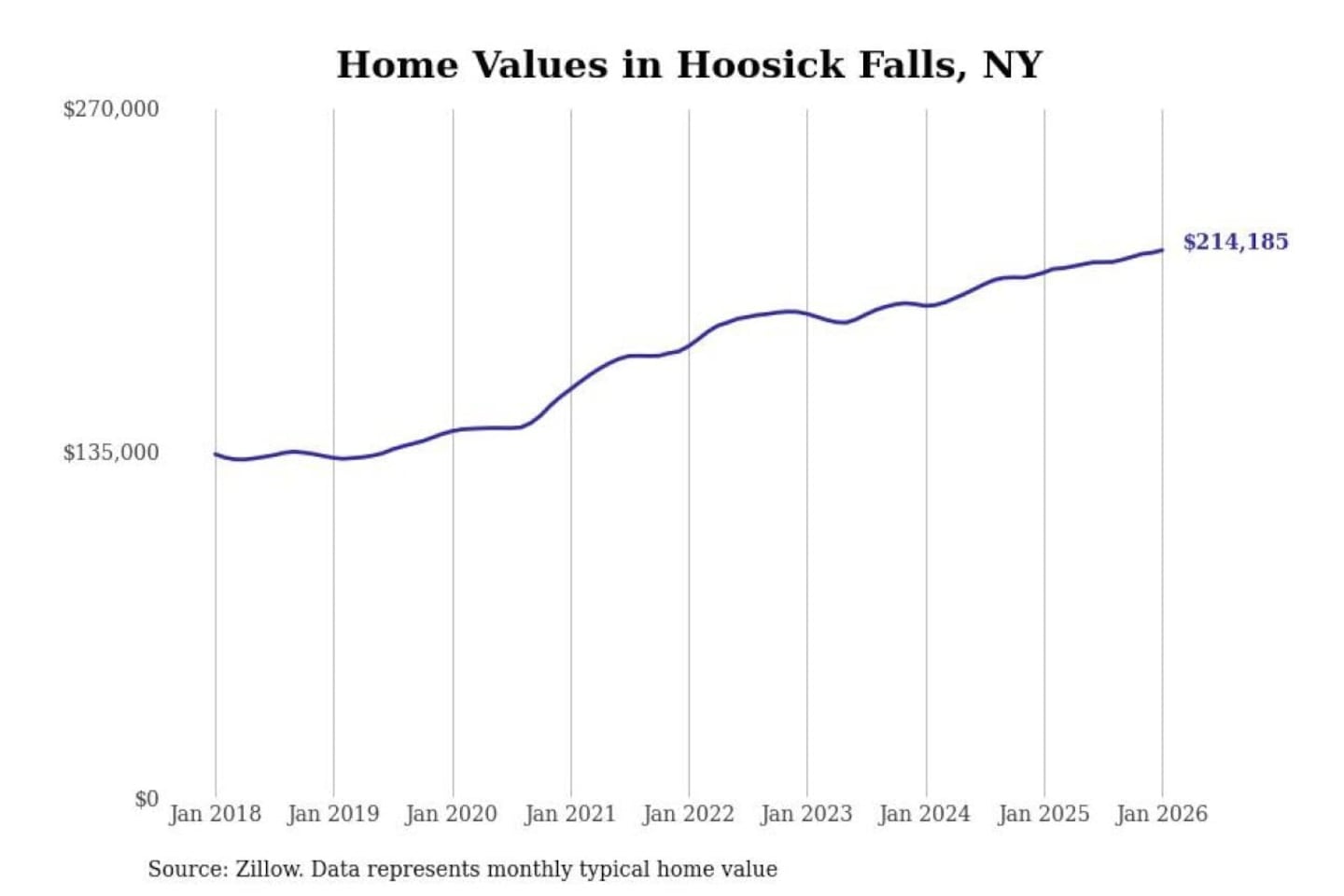 Stacker compiled a list of cities with the most expensive homes in the Albany-Schenectady-Troy, NY metro area using data from Zillow. Charts show the monthly typical home value since January 2018.