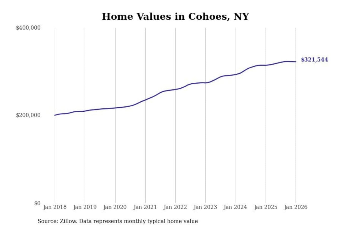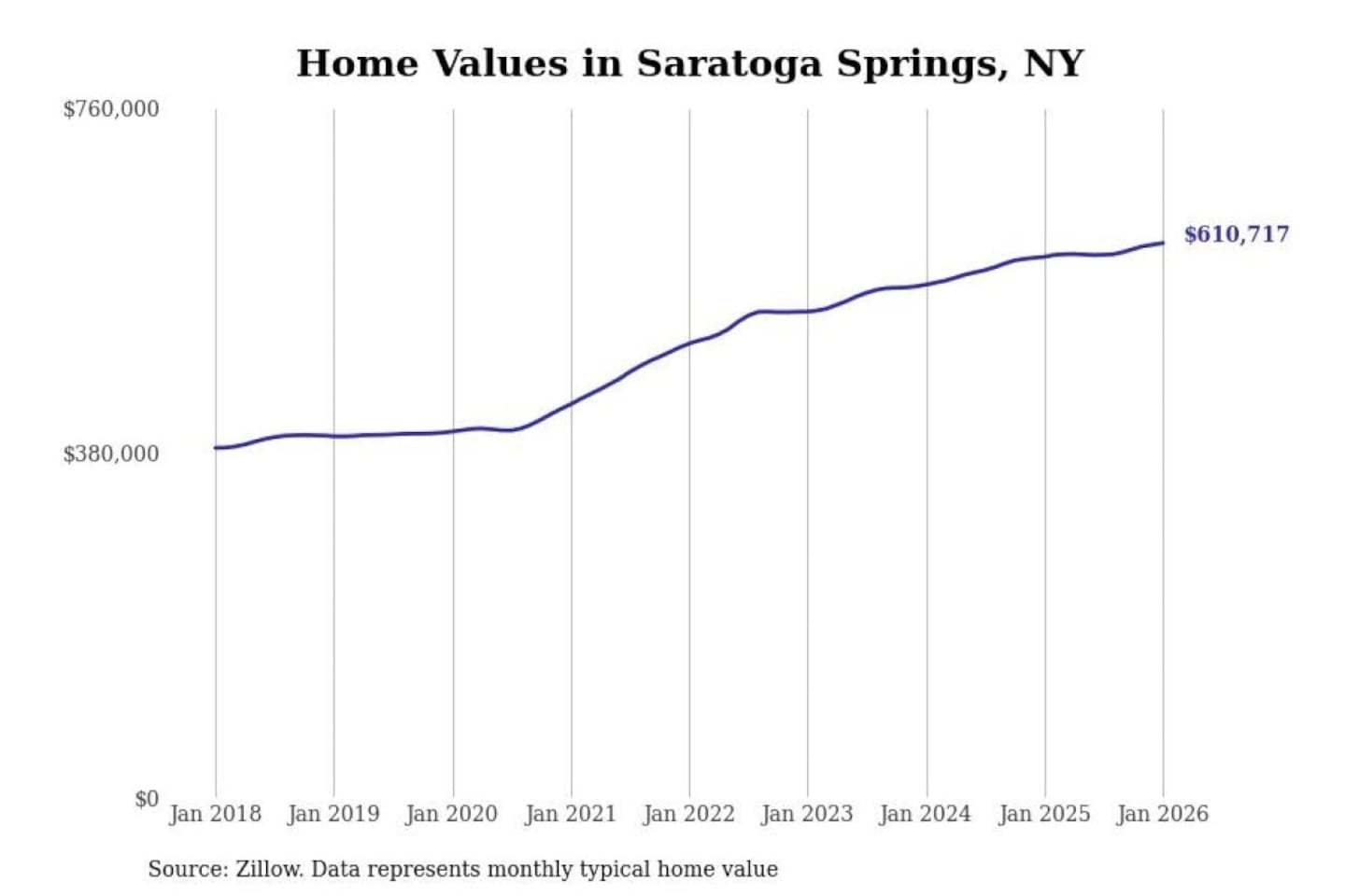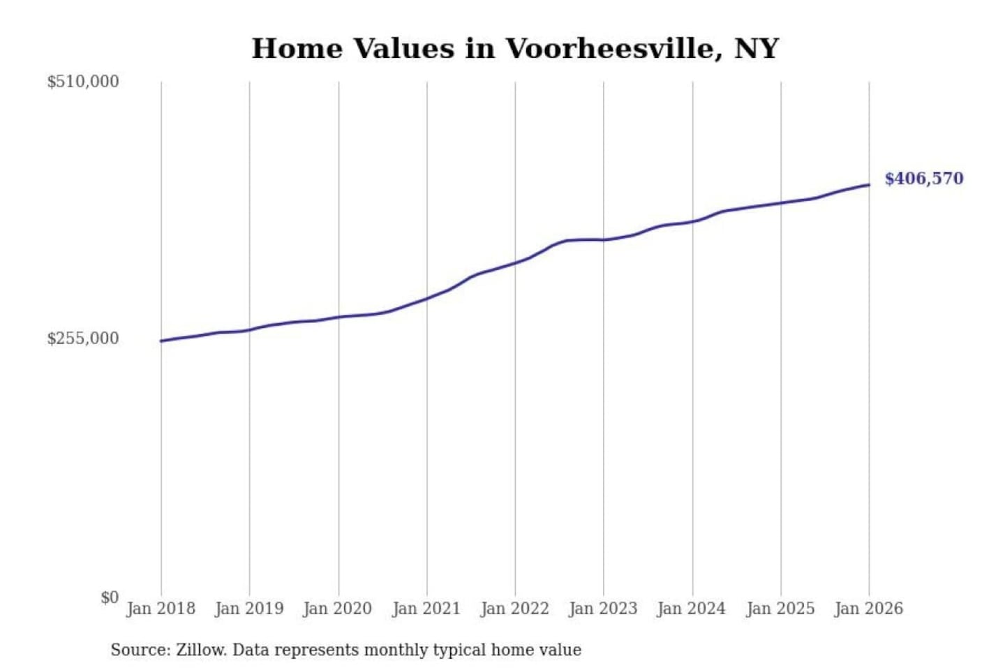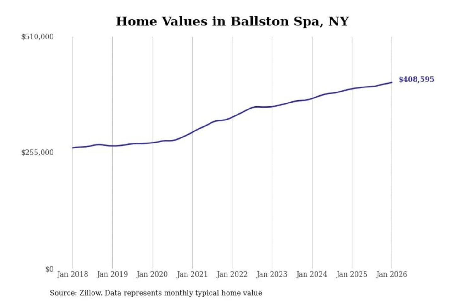 Stacker compiled a list of cities with the most expensive homes in the Albany-Schenectady-Troy, NY metro area using data from Zillow. Charts show the monthly typical home value since January 2018.