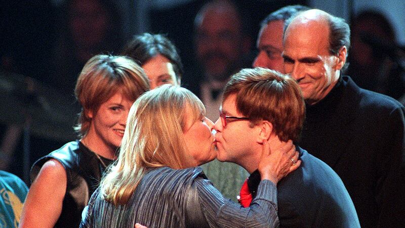 Joni Mitchell through the years 2000: Singer Joni Mitchell gets a kiss from Elton John as singers Shawn Colvin (L) and James Taylor (R) watch after the finale of Turner Network Television's "All-Star Tribute to Joni Mitchell" at the Hammerstein Ballroom on April 6, 2000, in New York City. The event featured numerous singers and musicians performing Mitchell songs. (Matt Campbell/AFP via Getty Images, File)