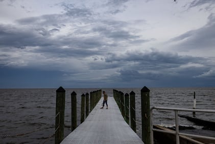 Idalia impact: A news reporter walks onto a dock ahead of Hurricane Idalia in Cedar Key. (Bloomberg/Bloomberg via Getty Images)