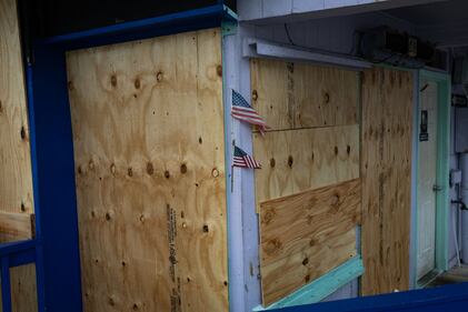 Idalia impact: American flags are placed on boarded windows ahead of Hurricane Idalia in Cedar Key. (Bloomberg/Bloomberg via Getty Images)