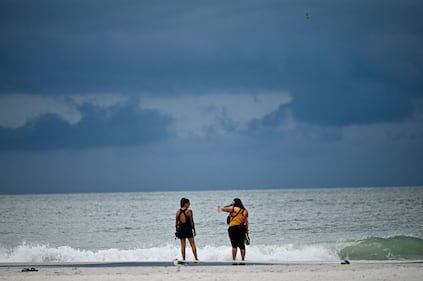Idalia impact: People enjoy the beach in the Tampa Bay area on Tuesday as dark clouds gather. (MIGUEL J. RODRIGUEZ CARRILLO/Miguel J. Rodriguez Carrillo/AFP)
