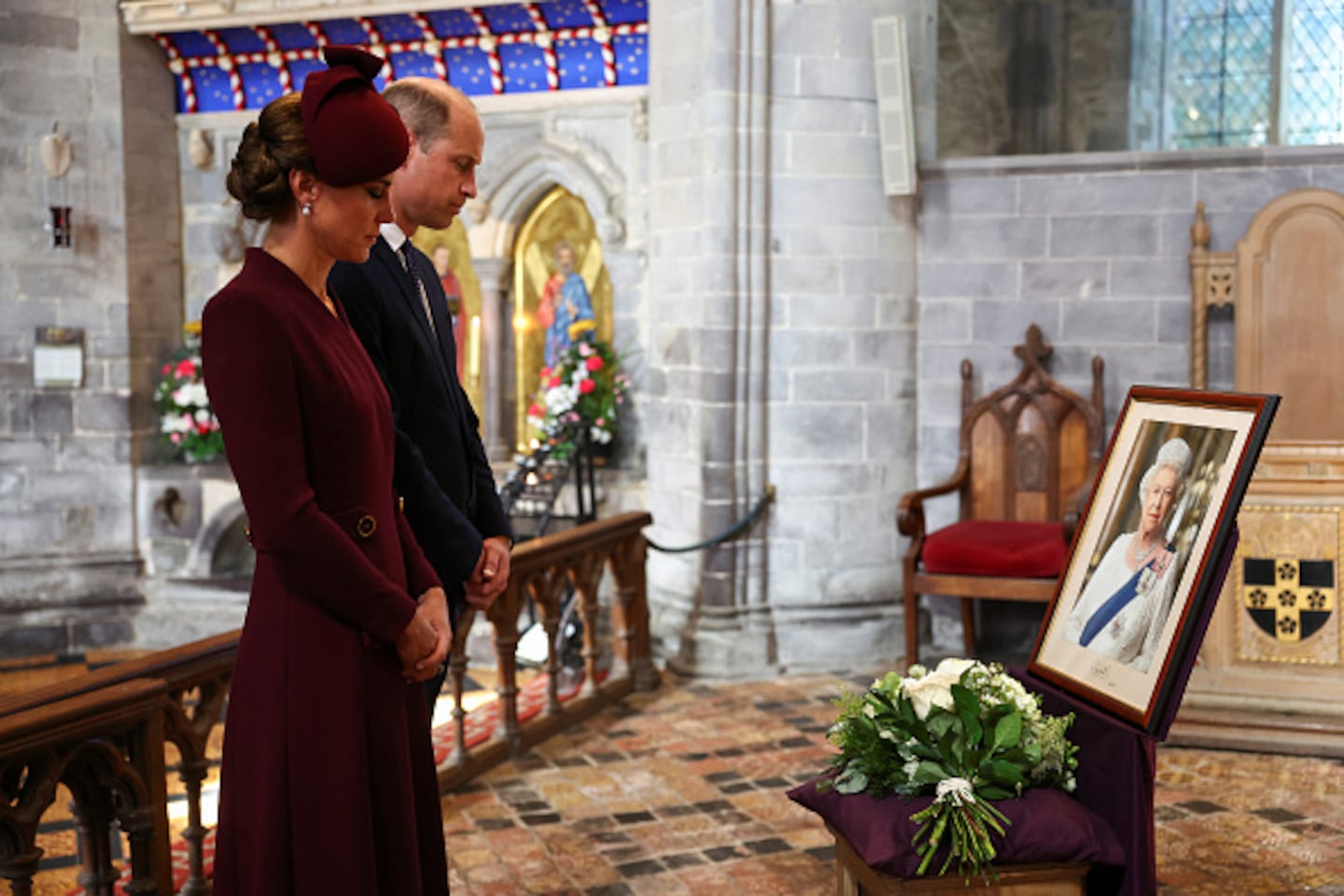 Remembering Queen Elizabeth II ST DAVIDS, WALES - SEPTEMBER 08: Prince William, Prince of Wales and Catherine, Princess of Wales attend a service at St Davids Cathedral, on the first anniversary of Queen Elizabeth's death, on September 8, 2023 in St Davids, Wales. Queen Elizabeth II passed away at her Balmoral Castle, her private Scottish residence, on September 8th 2022. This brought to an end her 70-year reign, the longest of a British monarch. Her funeral was held at Westminster Abbey on 19 September and she is buried in St George's Chapel at Windsor Castle. (Photo by Toby Melville - WPA Pool/Getty Images) (WPA Pool/Getty Images)