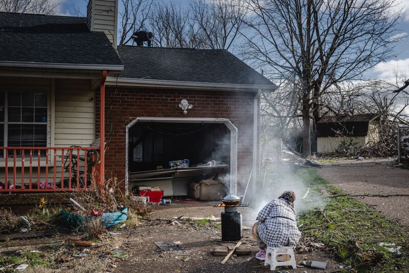 Storms rip through Tennessee: A resident cooks food in their driveway in the aftermath of a tornado on Dec. 10, 2023, in Madison, Tennessee. (Jon Cherry/Getty Images)