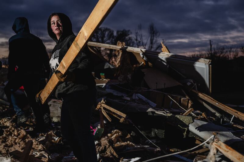 Storms rip through Tennessee: A resident of Clarksville, Tennessee, lifts a board to add to a pile in search of pets and belongings of a destroyed home in the aftermath of a tornado on Dec. 10, 2023. (Jon Cherry/Getty Images)