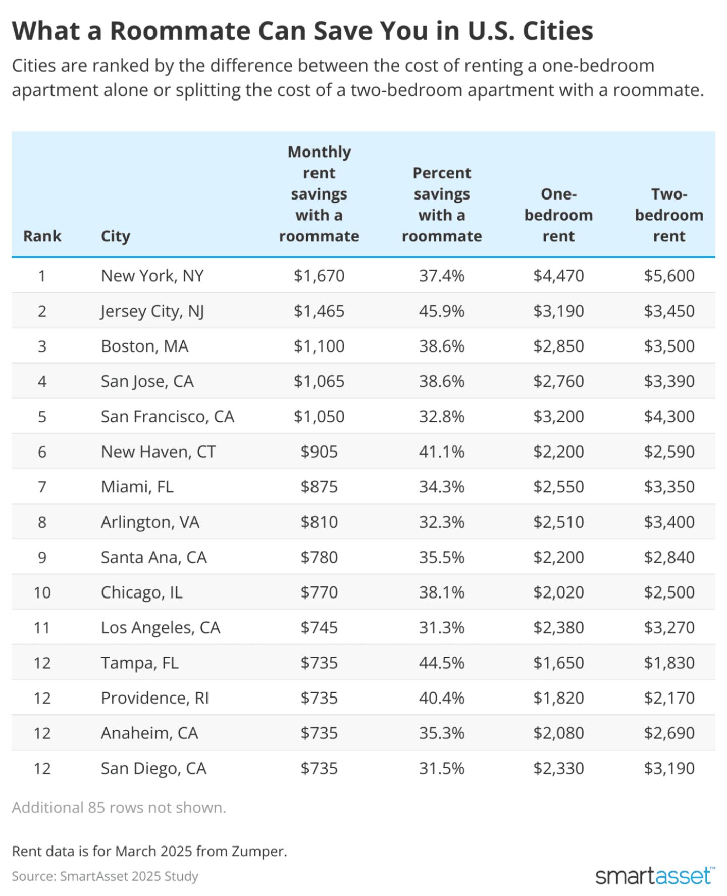 - Splitting an apartment with a roommate in New York City saves the most at $1,670 per month. Those in the Big Apple are facing an average rent price of $4,470 for a one-bedroom apartment, versus splitting a $5,600 two-bedroom apartment at $2,800 each. This is a 37.4% reduction in monthly rent costs. Across the Hudson River, Jersey City, New Jersey, residents see the second-highest dollar savings on rent with a roommate at $1,465.