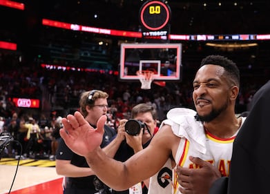 New York Knicks v Atlanta Hawks - Game Three ATLANTA, GEORGIA - APRIL 23: CJ McCollum #3 of the Atlanta Hawks reacts after their 109-108 win over the New York Knicks in game three of the Eastern Conference first round playoffs at State Farm Arena on April 23, 2026 in Atlanta, Georgia. NOTE TO USER: User expressly acknowledges and agrees that, by downloading and or using this photograph, User is consenting to the terms and conditions of the Getty Images License Agreement. (Photo by Kevin C. Cox/Getty Images) (Kevin C. Cox/Getty Images)