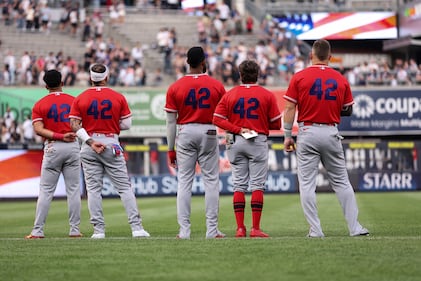 Los Angeles Angels v New York Yankees NEW YORK, NEW YORK - APRIL 15: The Los Angeles Angels line up during the national anthem before the game against the New York Yankees at Yankee Stadium on April 15, 2026 in New York City. All players are wearing the number 42 in honor of Jackie Robinson Day. (Photo by Dustin Satloff/Getty Images) (Dustin Satloff/Getty Images)
