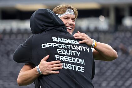 New York Giants v Las Vegas Raiders - NFL 2025 LAS VEGAS, NEVADA - DECEMBER 28: Jaxson Dart #6 of the New York Giants and JJ Pegues #92 of the Las Vegas Raiders embrace prior to the game at Allegiant Stadium on December 28, 2025 in Las Vegas, Nevada. (Photo by Ian Maule/Getty Images) (Ian Maule/Getty Images)